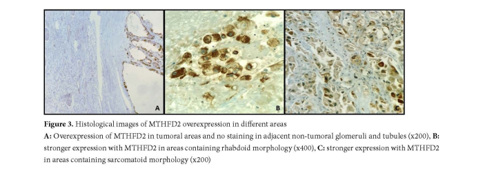 MTHFD2 overexpression was observed in tumor tissues in 66 (53%) of the 124 cases. No MTHFD2 expression was detected in adjacent non-neoplastic tissues. Stronger expression was particularly noted in areas exhibiting rhabdoid and sarcomatoid morphology (Figure 3).