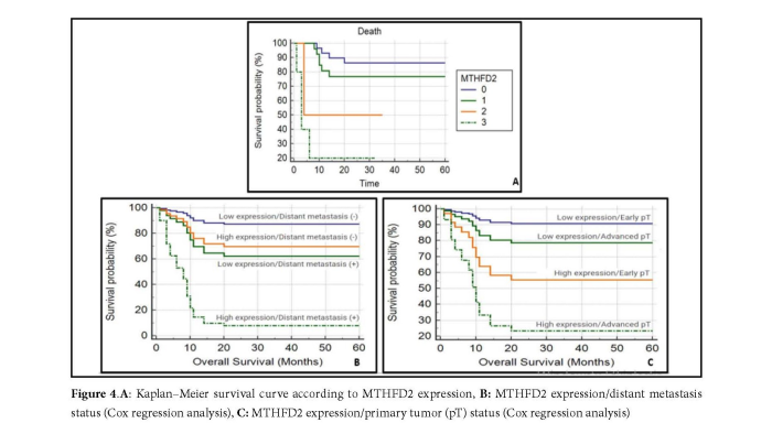 In multivariate Cox regression analysis—including MTHFD2 expression, pT stage, and presence of metastasis—MTHFD2 overexpression remained an independent prognostic factor for overall survival (Hazard Ratio = 5.25; 95% CI: 1.30–21.23; p = 0.0019).