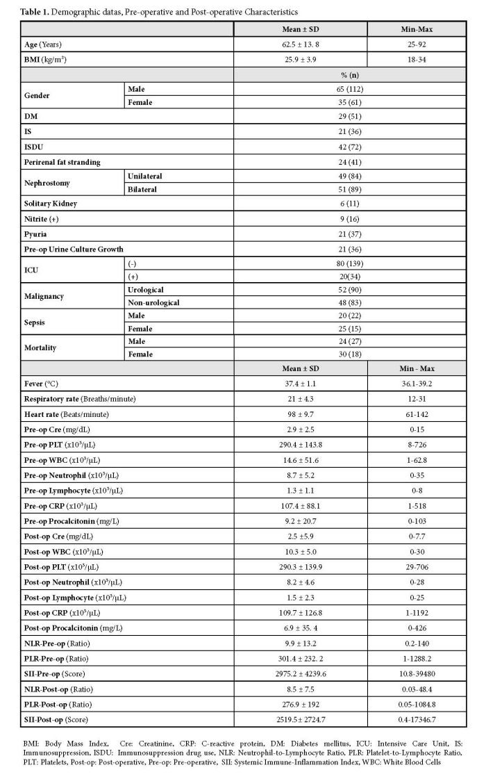 This study has several limitations, including its retrospective design, relatively small sample size, and single-center setting. Additionally, more detailed classification of malignancy types could have better illustrated the diversity of etiopathogenesis and inflammatory responses. The inclusion of data regarding chemotherapeutic agents, hormonal therapies or immunotherapies might have helped reduce heterogeneity and allowed for a more nuanced analysis. Due to the retrospective nature of our study, it was not possible to clearly differentiate between primary causes of mortality, which may have contributed to the high mortality rate observed. We believe that the actual mortality rate is likely lower, as our cohort consisted exclusively of cancer patients, and cancer-related deaths may have inflated the observed rate—constituting another important limitation of this study. Nevertheless, this study provides a foundation for future randomized prospective studies with larger cohorts, to evaluate dynamic changes in inflammatory markers. Including patients with benign causes of nephrostomy as a control group would enhance the understanding of malignancy-specific outcomes. Furthermore, assessing long-term results and quality of life would contribute the development of more comprehensive and evidence-based guidelines for the management of patients requiring nephrostomy.