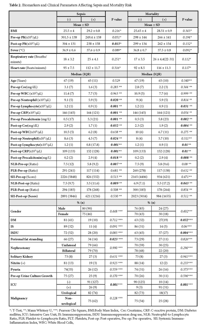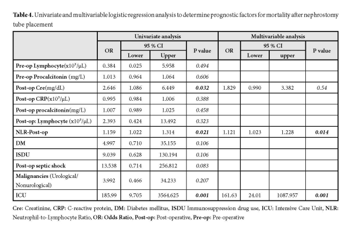 When evaluating the parameters associated with mortality, it becomes evident that, despite pathophysiological similarities with sepsis, certain distinctions are observed. Notably, neutropenia and thrombocytopenia do not emerge as significant predictive factors (Table 2,4). In contrast, low pre-op and post-op lymphocyte levels, reduced post-op NLR, elevated pre-op and post-op procalcitonin and post-op CRP levels appear as key predictors of mortality, consistent with their roles in sepsis. However, among these variables, only post-op NLR was found to be an independent predictor of mortality after nephrostomy in logistic regression analysis (Table 2,4). Lymphopenia reflects a weakened immune system in the context of infection and indicates an impaired adaptive immune response [16,21,22]. Additionally, creatinine levels following nephrostomy were identified as predictors of mortality in univariate analysis; however, this association did not remain significant in multivariable analysis (Table 2,4). Although mortality rates were statistically higher among patients with non-urological malignancies, logistic regression analysis revealed no significant difference in mortality between patients with urological and non-urological malignancies (Table 2,4). Diabetes mellitus and ISDU complicate management of infections, particularly in the context of immunosuppression induced by sepsis and malignancy. These conditions exacerbate septic progression, increase the likelihood of complications, and elevate the risk of mortality [15,23,24]. Interestingly, while a statistically significant association (p<0,05) was found between DM and ISDU with mortality in our cohort, logistic regression analysis showed that they were not independent predictors of mortality. These results suggest that although DM and ISDU may indicate disease severity, they do not necessarily translate into increased mortality risk in all settings, highlighting the need for individualized patient assessment (Table 2,4). ICU admission emerged as a key predictor of both sepsis and mortality. ICU management strategies play a crucial role in directly influencing patient outcomes. The literature emphasizes that early ICU admission and timely implementation of supportive therapies can significantly reduce mortality rates [25]. In this context, the strong association between ICU admission and mortality observed in our study is consistent with findings in the literature. Furthermore, among the parameters variables included in multivariable logistic regression analysis, post-op ICU admission was identified as independent predictor of mortality (Table 4).
