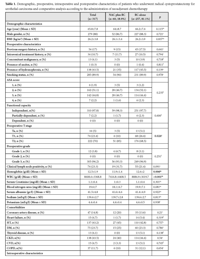 The demographic (age, gender and body mass index [BMI], preoperative (previous surgery history, intravesical treatment history, neoadjuvant chemotherapy history, concomitant malignancy, presence of ascites, presence of hydronephrosis, smoking status, American Society of Anesthesiologists classification [ASA] score, functional capacity, T stage, grade, clinical lymph node positivity, hemoglobin, white blood cell [WBC], serum creatine, blood nitrogen urea, serum albumin, sodium and potassium levels, comorbidities), intraoperative (operation duration, incision length, urinary diversion technique, length of bowel segment used in urinary diversion, amount of bleeding,) and postoperative (amount of blood transfusion, duration of total parenteral nutrition administration, hospitalization, time to oral nutrition, ureteral catheterization duration, complications, pathological T stage, pathological N stage) characteristics of patients were collected from hospital database. The patients were divided into two groups according to the administration of neoadjuvant chemotherapy. The comparison was made between the two groups in terms of perioperative outcomes.