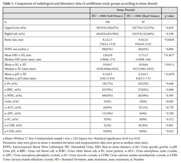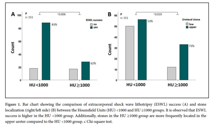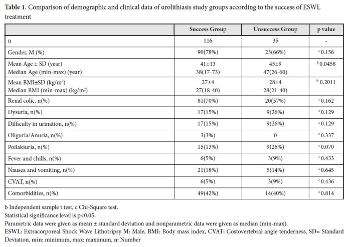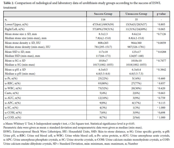 The study that was conducted as a single-center analytical cross-sectional retrospective study, examined approximately 450 patients who came to the Sancaktepe Education and Research Hospital urology clinic with suspicion of urolithiasis between June 2023 and June 2024. Patients with ureteral stones detected by Non-Contrast Computed Tomography (NCCT) and complete clinical data were selected for the study. Of these patients, 151 patients who had an indication for ESWL treatment due to ureteral stones were included in the study. The density of the stones was measured in HU. Demographic characteristics (age, gender, BMI), symptoms [renal colic, oliguria/anuria, nausea and vomiting, dysuria, difficulty urinating, pollakiuria, fever and chills, and costovertebral angle (CVA) tenderness (CVAT)] and urine examination findings [hematuria, urine color, urine odor, density, pH, erythrocytes, leukocytes, casts, protein, calcium oxalate monohydrate (COM) or calcium oxalate dihydrate (COD) crystals, Struvite crystals, amorphous urate crystals, amorphous phosphate crystals] were recorded. In addition, patients were questioned about physical inactivity, oral contraceptives (OCs) use, and comorbidity status (hypertension, diabetes, metabolic syndrome, obesity, chronic kidney disease, cardiovascular diseases, gout, hyperlipidemia, inflammatory bowel disease, osteoporosis, malignancy, thyroid disease, uric acid metabolism disorder, and hypercoagulability, etc.). Those included in the study groups were divided into 2 groups according to the success of ESWL treatment, 116 of them were successful in treatment, while 35 patients were unsuccessful.