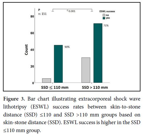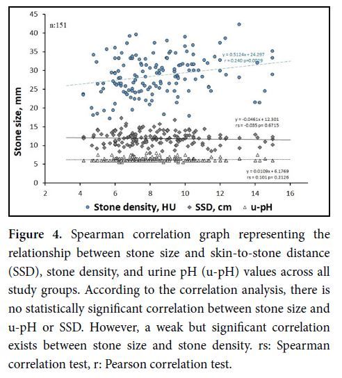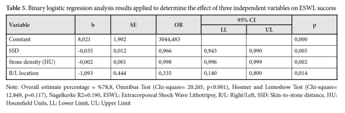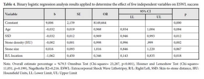 IBM SPSS Statistic Software program (Version-27, Chicago, USA) was used for processing the data obtained from the study and for statistical evaluation. Kolmogorov Smirnov test was used for normality test of the data. Chi square test was applied for evaluation of categorical data. Student t test and Mann-Whitney test were used for comparison of parametric and non-parametric data of two groups, respectively. Pearson correlation analysis and Spearman correlation analysis were performed for examination of the relationship between parametric and non-parametric data of independent variables, respectively. Binary logistic regression analysis was applied using independent variables consisting of age, lower/upper localization, SSD, stone density and stone size, which are thought to influence ESWL success. Bar chart and box plots graphics were used for presentation of non-parametric data.