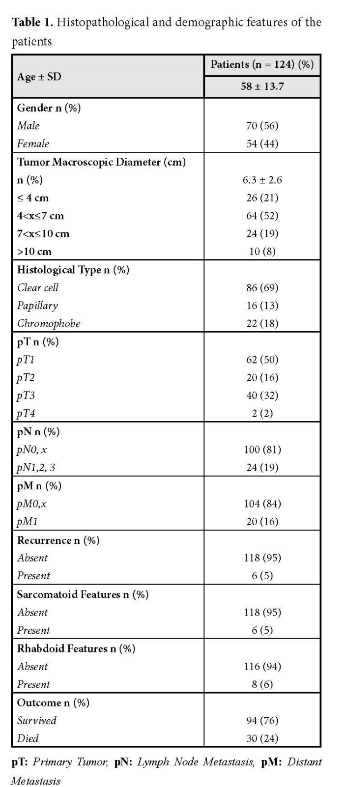 A total of 124 patients were included in the study, with a mean age of 58 ± 13.7 years (range: 17–85). The male-to-female ratio was 1.3. The histological subtypes of RCC were distributed as follows: clear cell RCC in 69% of cases, papillary RCC in 13%, and chromophobe RCC in 18%. The mean tumor diameter was 6.3 ± 2.6 cm (1.3–13 cm) (Table 1).