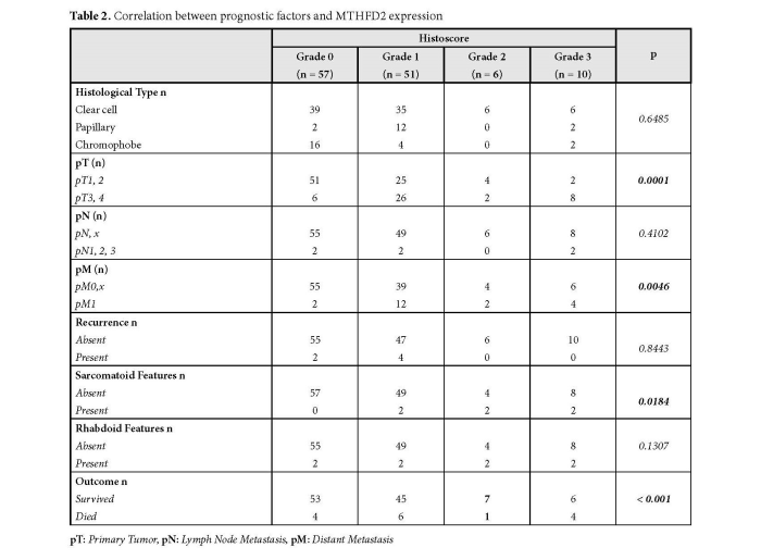 MTHFD2 overexpression was significantly associated with adverse pathological features including advanced pT stage, presence of distant metastasis, and sarcomatoid differentiation (all p < 0.05). Moreover, high MTHFD2 expression correlated significantly with key determinants of pT staging such as invasion into the renal pelvis and perirenal adipose tissue (p < 0.05 for all). Additionally, an important association was observed between MTHFD2 expression and histological grade in clear cell and papillary RCC (p = 0.037).