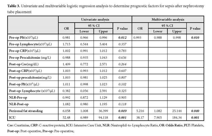 In our study, ICU admission emerged as an independent predictor of sepsis in both univariate and multivariable analyses. This finding indicates that patients requiring ICU-level care are at significantly higher risk for developing sepsis, even after adjusting for other clinical factors. ICU admission likely reflects early physiological deterioration and increased disease burden. Therefore, the presence of ICU-level needs should be regarded as an early warning sign, prompting heightened clinical vigilance and timely interventions to prevent or mitigate sepsis. Another independent predictor of sepsis identified in our study was the presence of perirenal fat stranding (Table 2–3). Inflammation within the perirenal fat tissue contributes to an increased microbial burden and a heightened risk of bacterial infections. It is well known that invasive interventions under such inflammatory conditions can significantly elevate the risk of sepsis [5,17]. The Mayo Adhesive Probability (MAP) score is a valuable tool for evaluating the inflammatory burden of perirenal fat tissue and estimating the associated risks of infection and surgical complications. An elevated MAP score serves as a reliable indicator of severe perirenal inflammation and the potential progression of infection [18–20]. The integration of predictive scoring systems, such as the MAP score, into the clinical management of similar patient populations may enhance clinical decision-making and optimize treatment strategies.