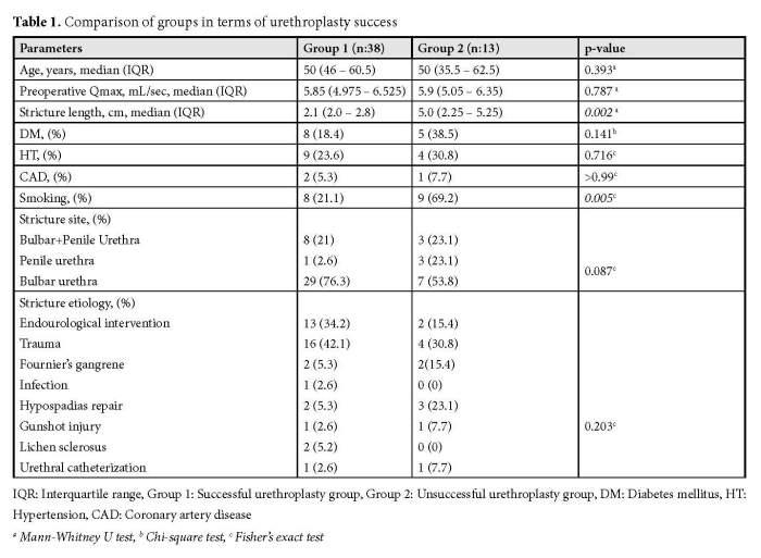 Urethral strictures are a common problem in urology and can lead to significant morbidity. Various techniques, including urethral dilation, DVIU, and surgical reconstruction, are used in the treatment of urethral strictures, with surgical reconstruction generally providing superior long-term outcomes. Although skin flaps, bladder mucosa, and penile and preputial flaps have been used in urethroplasties, oral mucosal grafts remain the most commonly utilized material (10). Oral mucosal grafts can be harvested more easily than penile flaps and have a lower risk of morbidity. Additionally, they possess a thick epithelium with a thin lamina propria and a dense panlaminar vascular plexus, which facilitates early inosculation. Chapple et al., in their systematic review, reported that the success rates of augmentation urethroplasty varied between 43% and 100%, depending on the surgical technique used(15). The observed success rate of 74.5% in this study is consistent with previously published data and further supports the effectiveness of buccal mucosal graft urethroplasty.