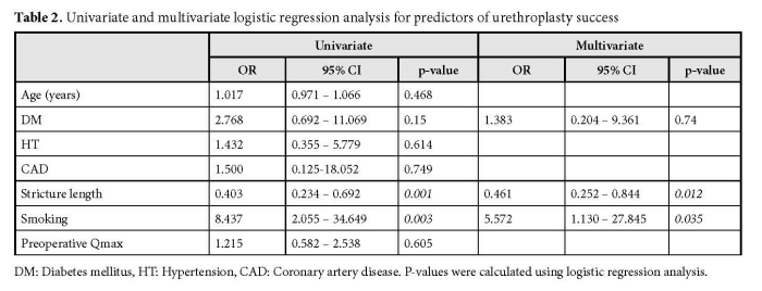Although BMG urethroplasty generally yields high success rates, several factors may contribute to recurrence, including stricture location and length, etiology, whether the procedure is primary or a revision, and the patient’s overall health status(17). Among these, stricture length is the most frequently emphasized factor in the literature. Shalkamy et al. identified stricture length greater than 4.5 cm as a predictor of urethroplasty failure(18). Consistently, Kay et al. reported that strictures longer than 5 cm were associated with a significantly increased risk of recurrence (19). Our findings indicated that patients in the failure group had longer strictures than those in the successful group, in line with previous studies. Moreover, both univariate and multivariate analyses confirmed stricture length as an independent risk factor for recurrence following urethroplasty.