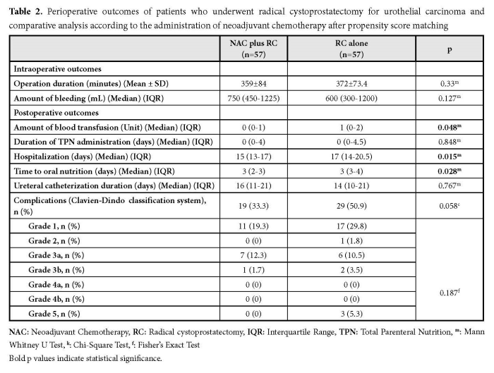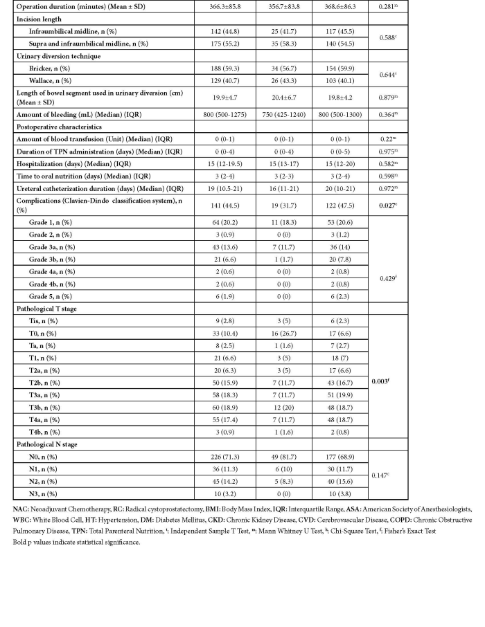 The demographic (age, gender and body mass index [BMI], preoperative (previous surgery history, intravesical treatment history, neoadjuvant chemotherapy history, concomitant malignancy, presence of ascites, presence of hydronephrosis, smoking status, American Society of Anesthesiologists classification [ASA] score, functional capacity, T stage, grade, clinical lymph node positivity, hemoglobin, white blood cell [WBC], serum creatine, blood nitrogen urea, serum albumin, sodium and potassium levels, comorbidities), intraoperative (operation duration, incision length, urinary diversion technique, length of bowel segment used in urinary diversion, amount of bleeding,) and postoperative (amount of blood transfusion, duration of total parenteral nutrition administration, hospitalization, time to oral nutrition, ureteral catheterization duration, complications, pathological T stage, pathological N stage) characteristics of patients were collected from hospital database. The patients were divided into two groups according to the administration of neoadjuvant chemotherapy. The comparison was made between the two groups in terms of perioperative outcomes.