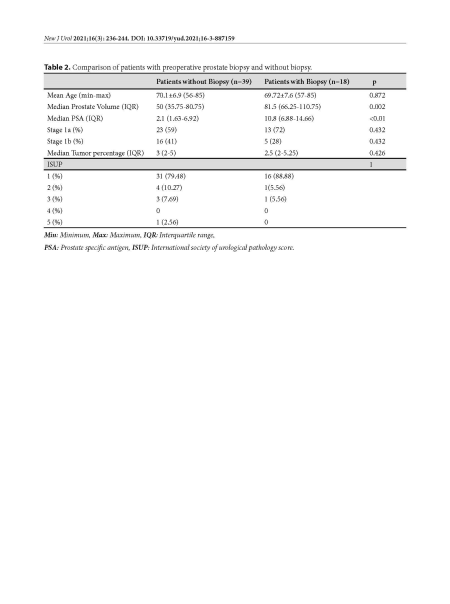 Results: A total of 1020 patients were surgical- ly treated for benign prostate hyperplasia between January 2014 and December 2019. Incidental PCa was diagnosed in 57 (5.6%) patients. 51 (89%) of the patients had TURP and 6 (11%) had TVP. Mean age was 69.9±7.1 years and mean PSA value was 5.3±4.8 ng/ml. Majority of the patients (82.4%) had a Gleason score of 6 (3+3) and 37 (64.9%) pa- tients were reported as stage 1a. Patients with pre- operative prostate biopsy have significantly higher prostate volume and PSA values compared to the patients without biopsy (p<0.01). Active surveil- lance was performed in 42 patients, 2 patients un- derwent radical prostatectomy, 6 patients had ra- diotherapy and 7 patients had androgen blockade. Conclusion: We have an incidental PCa rate similar to the literature. Majority of the patients have stage 1a disease and a Gleason score of 6. Most of the patients were managed conservatively.
